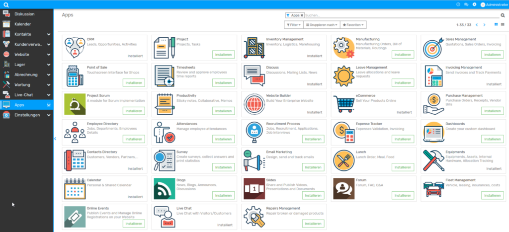 Odoo ofrece decenas de aplicaciones; CRP, contabilidad, facturas, creador de sitios web, comercio electrónico, marketing por correo electrónico, gestión de proyectos, inventario y muchas otras aplicaciones más. Este amplio conjunto de posibles aplicaciones es adecuado para casi cualquier tipo de negocio que pueda tener. Además, el diseño de la interfaz de usuario del sistema es muy moderno según los estándares actuales.